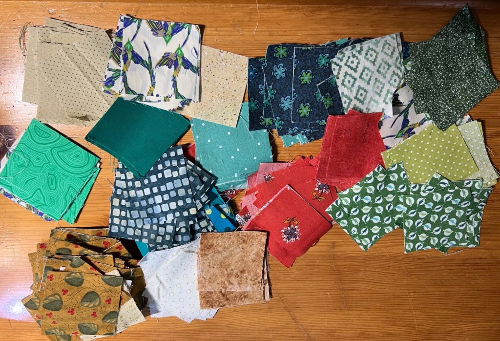 Smaller pieces—fabric scraps and snippets—often end up in a bin, mixed together and waiting for consideration in creating smaller projects. For pieces that fall somewhere in between—larger than scraps but smaller than about half a yard—I’ve developed a system that works well for me. I cut them into 2½-inch squares.