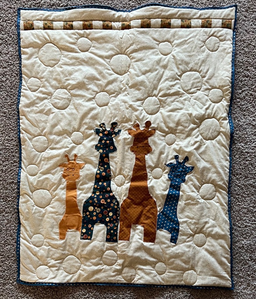 This particular branch of the family has a ‘thing’ for giraffes. So, I thought and thought about how to incorporate a giraffe into the quilt I would give them upon the baby’s arrival. I looked at lots of images of giraffes and drew picture after picture of what I might sew for them.
